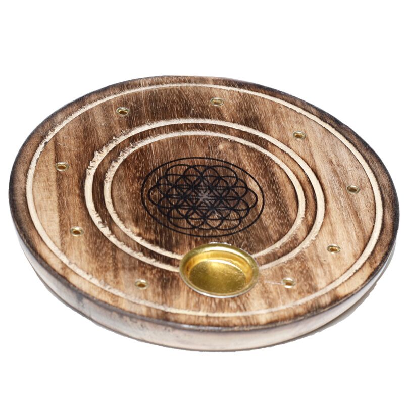 Mango Wood Round Flower of Life Ashcatcher Incense Sticks & Cones Burner