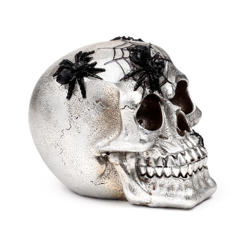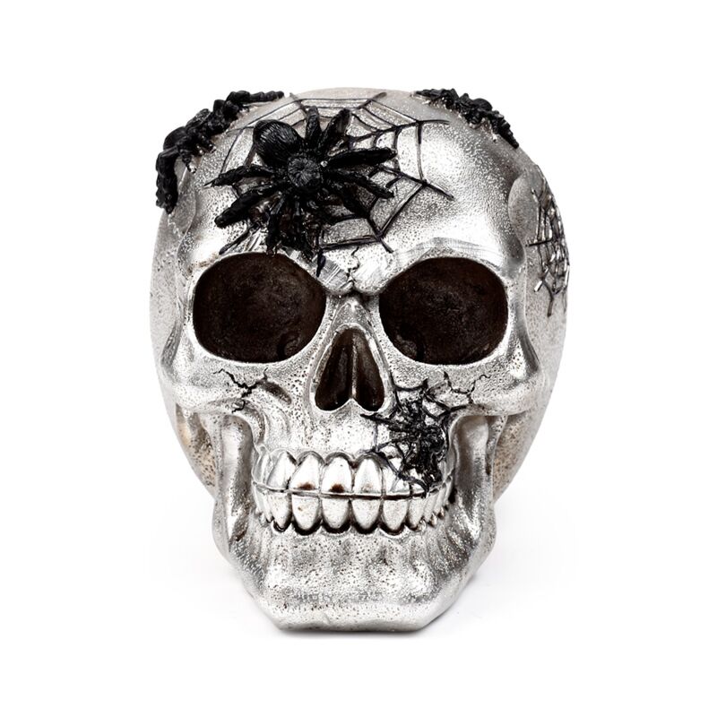 Decorative Ornament - Silver Skull with Black Spiders & Webs